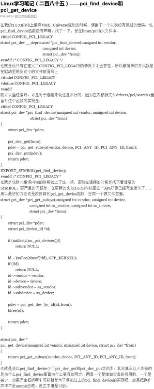 用Xilinx PCIE demo的時候,編譯了一個xapp1022提供的Linux驅動,出錯提示找不到pci_find_device函數。說明上說這個驅動是fedora上的,當前環境是Centos7。驅動中使用的頭文件只有一個linux/pci.h與pci有關,所以進去看了一下,沒有。