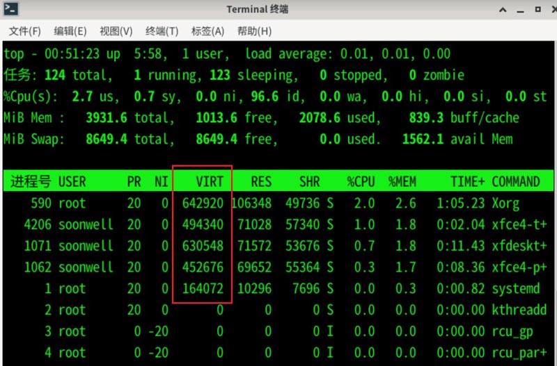 打開終端,輸入top,按回車鍵執行命令,top命令執行結果,【VIRT】一欄即為進程占用的虛擬內存大小。