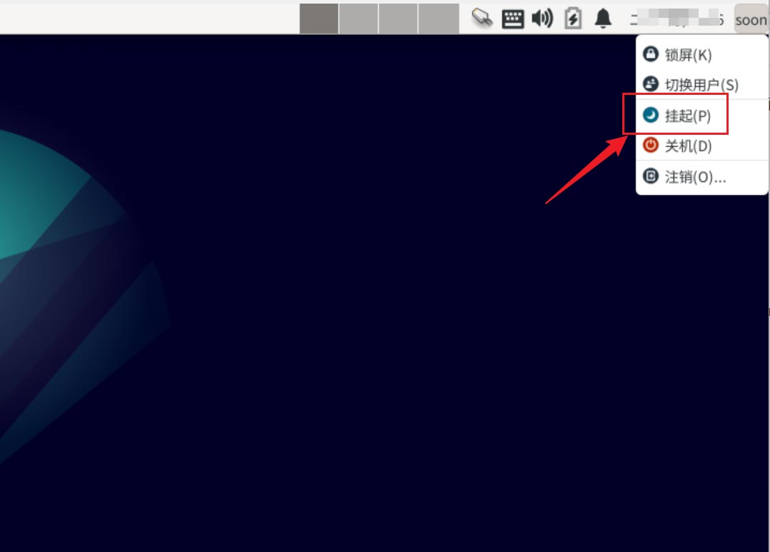 單擊右上角用戶名,下拉菜單中單擊【掛起】。