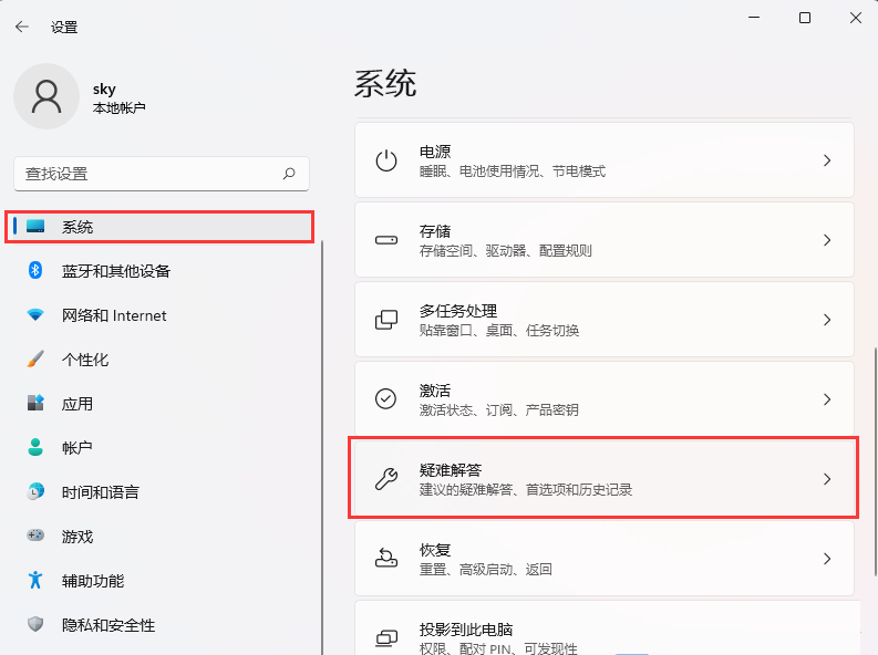 2、Windows 設(shè)置窗口,左側(cè)邊欄,點擊【系統(tǒng)】,右側(cè)找到并點擊【疑難解答(建議的疑難解答、首選項和歷史記錄)】;