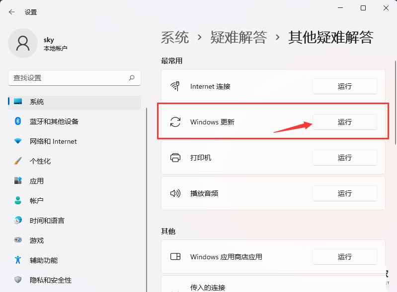 4、當前路徑為:系統(tǒng) 》 疑難解答 》 其他疑難解答,最常用下,點擊Windows 更新旁邊的【運行】;