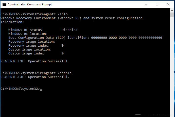 重置失敗常見的原因是Windows RE沒有啟動或損壞。你可以在命令提示符中輸入以下命令: