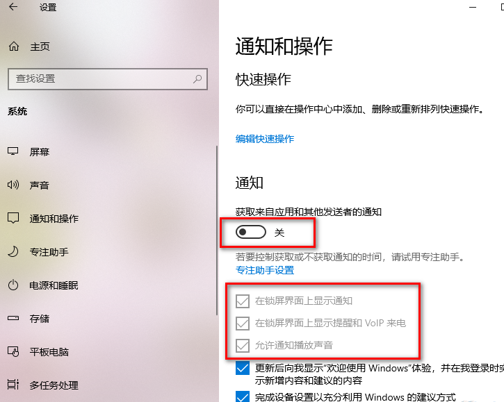 5.我們可以將【獲取來自應用和其他發送者的通知】的開關按鈕點擊關閉即可,關閉之后,那么下方的通知選項就會自動取消勾選,如圖所示。