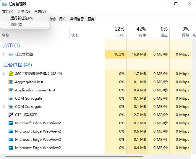 4、如果不小心結束了Windows 資源管理器進程,也可以在任務管理器窗口,點擊左上角的【文件】,在打開的下拉項中,選擇【運行新任務】;