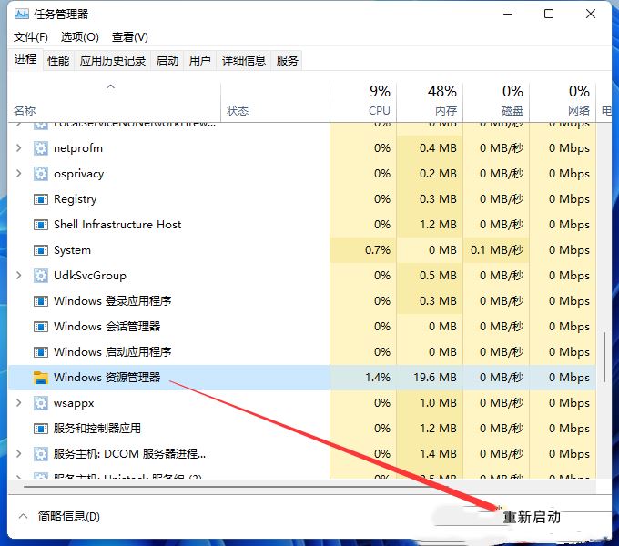 3、任務管理器窗口,選擇Windows 資源管理器進程,點擊右下角的【重新啟動】,即可重啟Windows 資源管理器,這其實是Windows 資源管理器進程explorer.exe結束后,又重新啟動的過程;