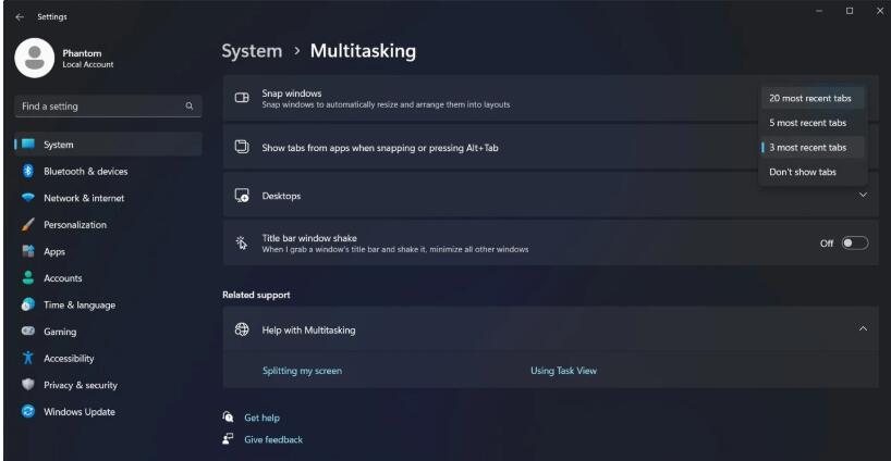 在“設置”>“多任務處理”下,“Snap 窗口”最近標簽上限新增 20 個選項。用戶可以使用 ALT + TAB 快捷鍵,或者在 Snap Assist 視圖中可以看到這些標簽,此前選項包括“不顯示標簽”、“最近 3 個標簽”、“最近 5 個標簽”。