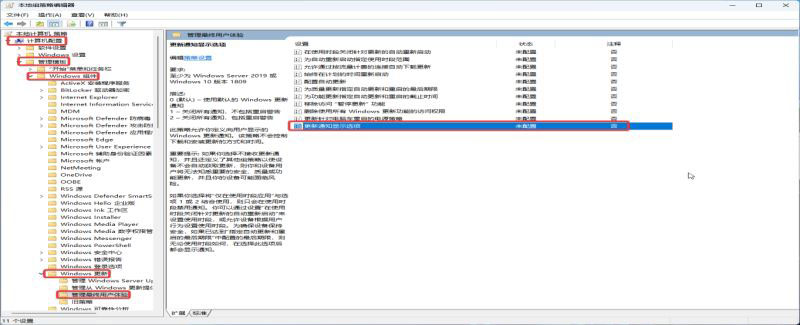 2. 在“本地組策略編輯器”窗口中,訪問“計算機配置”--》“管理模板”--》“Windows 組件”--》“Windows 更新”--》“管理最終用戶體驗”,找到“更新通知顯示選項”。