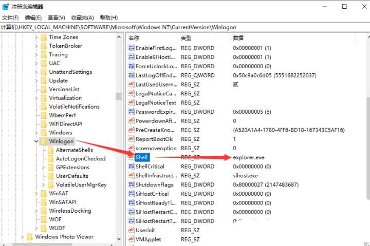 4、左側(cè)點(diǎn)擊【W(wǎng)inlogon】,右側(cè)點(diǎn)擊【Shell】。雙擊Shell,如果Shell的數(shù)值數(shù)據(jù)為【explorer.exe】,則是正確的,如果不是 explorer.exe ,則把Shell的數(shù)值數(shù)據(jù),更改為 explorer.exe ,最后,點(diǎn)擊【確定保存】,并重啟電腦就可以了;