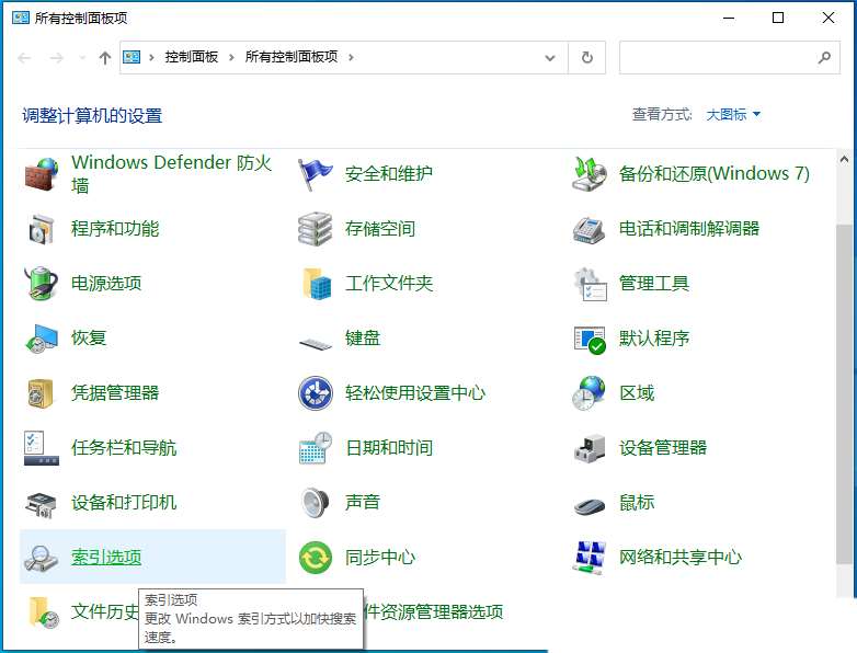 2、所有控制面板項窗口,切換到【大圖標】查看方式,調(diào)整計算機的設置下,找到并點擊【索引選項(更改 Windows 索引方式以加快搜索速度)】;
