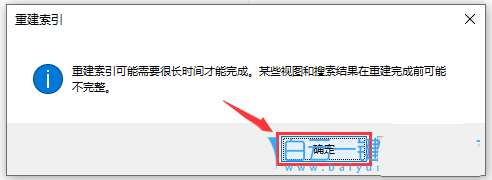 5、重建索引提示框,重建索引可能需要很長時間才能完成。某些視圖和搜索結(jié)果在重建完成前可能不完整。點擊【確定】;
