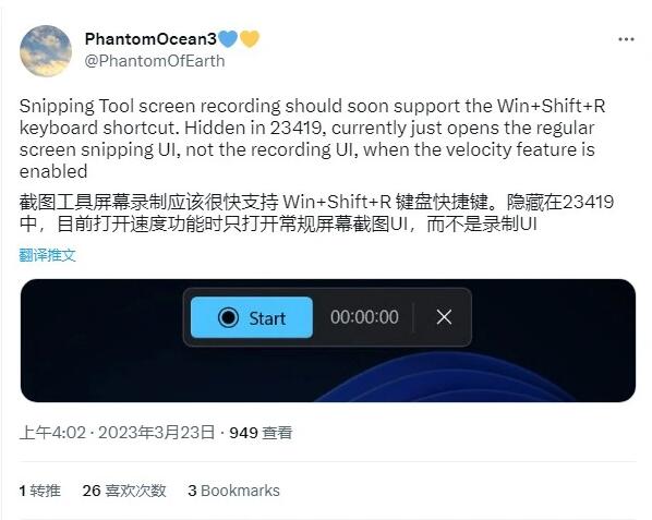 Win11 Build 23419 預覽版引入新特性:使用 Win + Shift + R 快捷組合鍵來錄制屏幕