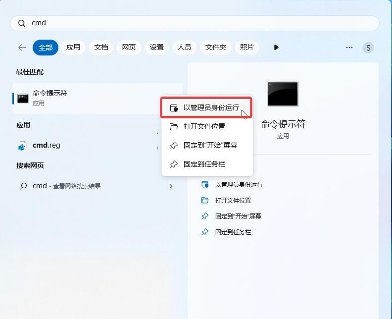 2. 按下 Win 鍵(或者使用鼠標)打開開始菜單,輸入“cmd”,然后選擇“以管理員權限”打開命令提示符