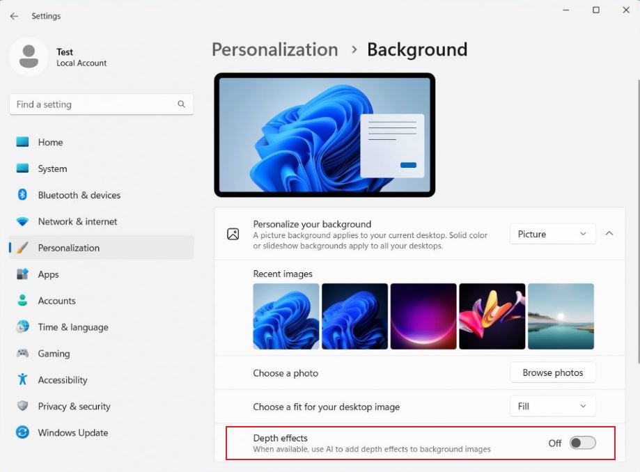 根據開關描述,當用戶打開該選項后,Windows 11 將使用 AI 來為當前背景圖片(壁紙)添加一個景深效果,也就是突出顯示一部分,另一部分則是模糊的,聽起來有點像手機拍照時的人像模式。