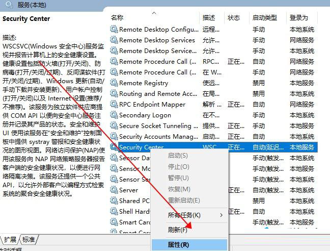 3、在打開的服務(wù)窗口中,找到Security p服務(wù)項(xiàng),在彈出菜單中選擇“屬性”菜單項(xiàng)。