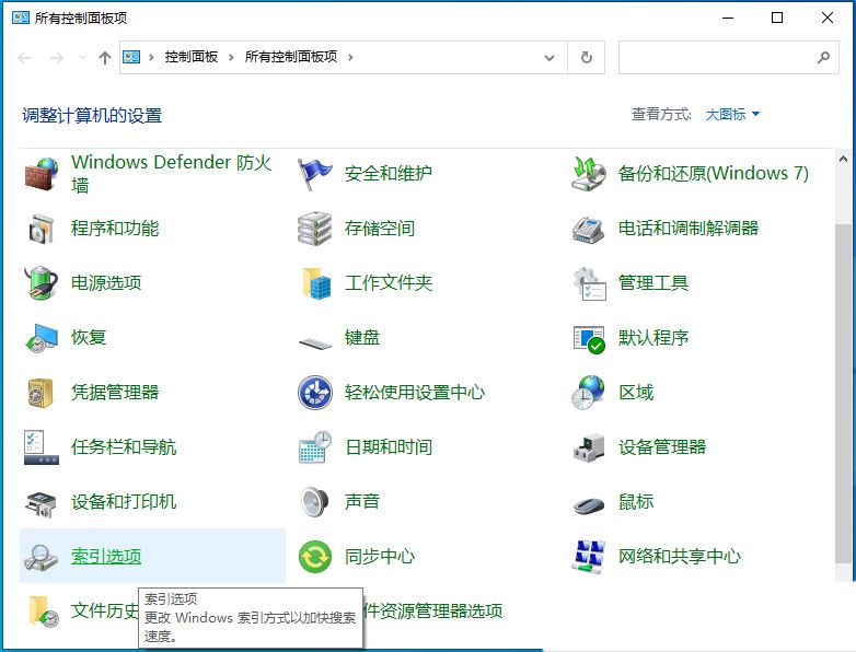 2、所有控制面板項窗口,切換到【大圖標】查看方式,調整計算機的設置下,找到并點擊【索引選項(更改 Windows 索引方式以加快搜索速度)】;
