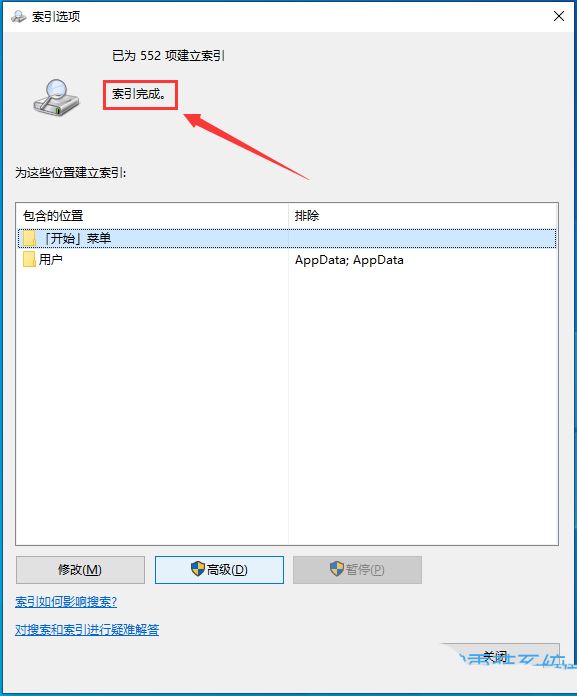 6、提示索引完成,然后重啟電腦即可;