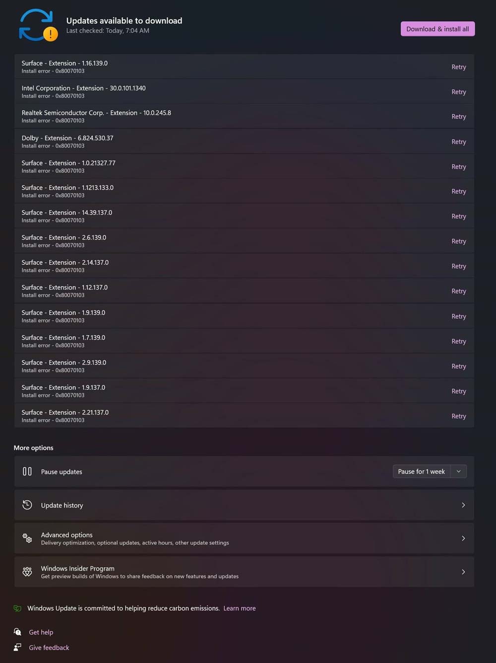 我們查詢了用戶的相關反饋,發現微軟自家的 Surface 設備在安裝過程中也出現了上述錯誤。此外本次更新還導致 Realtek、 Intel、Dolby、Dell 的各種驅動程序無法正常安裝。