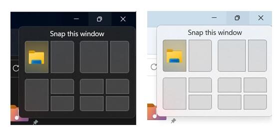 在這個(gè)版本中還有一個(gè)新的實(shí)驗(yàn)性 UI,用于下拉菜單,當(dāng)懸停在應(yīng)用窗口的最大化按鈕上時(shí)出現(xiàn)。這些實(shí)驗(yàn)包括在突出顯示的 Snap 區(qū)域顯示應(yīng)用圖標(biāo),以及加入“Snap 此窗口”的文字,使用戶更清楚這個(gè)界面的作用。