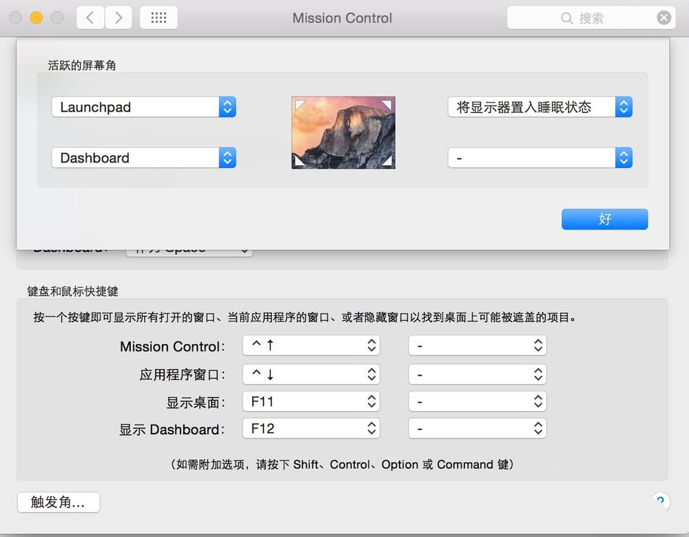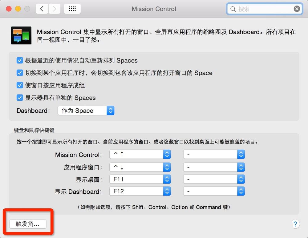 mission control中有些常規(guī)設(shè)置,點(diǎn)擊左下角的=》 觸發(fā)角