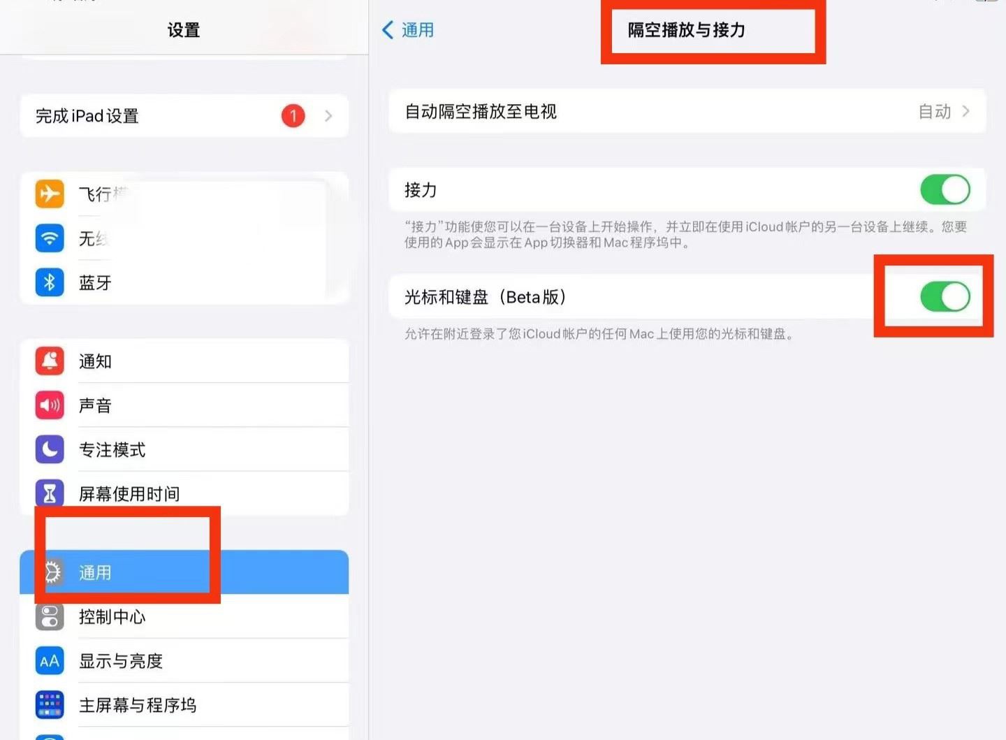 在ipad上進入“設置”-“通用”-“隔空播放與接力”,打開“光標和鍵盤”的開關