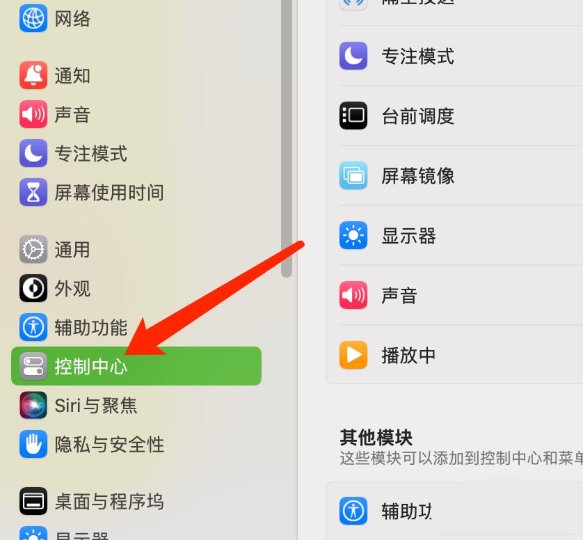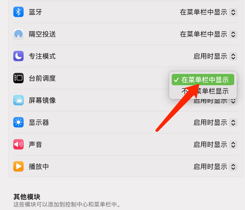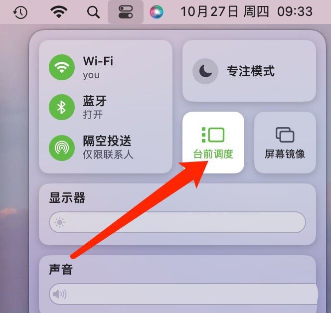 打開Mac系統的控制中心,可設置在菜單欄中顯示臺前調度。操作步驟如下:
