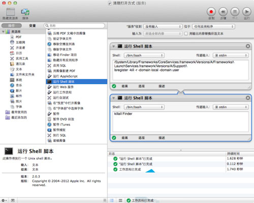 首先打開系統(tǒng)里的 「Automator」 ,新建一個(gè)服務(wù),然后將兩個(gè) shell 腳本拖到流程圖里并輸入代碼。