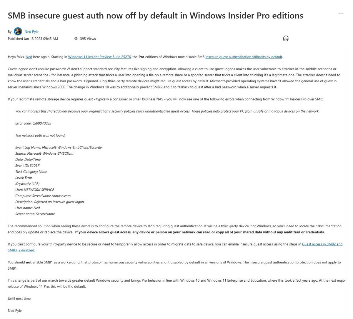 微軟官方技術(shù)博客近日更新了一篇博文,微軟首席項(xiàng)目經(jīng)理 Ned Pyle 表示 Win11 專業(yè)版即將默認(rèn)禁用 SMB 來(lái)賓認(rèn)證服務(wù),認(rèn)為這項(xiàng)服務(wù)存在諸多不安全的地方。