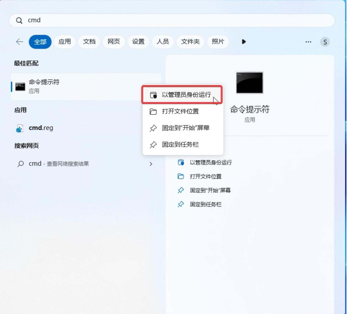 2. 按下 Win 鍵(或者使用鼠標(biāo))打開開始菜單,輸入“cmd”,然后選擇“以管理員權(quán)限”打開命令提示符