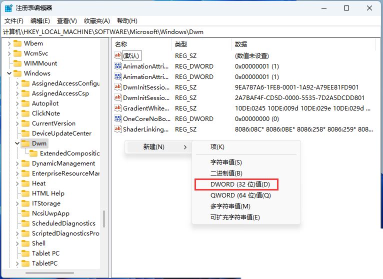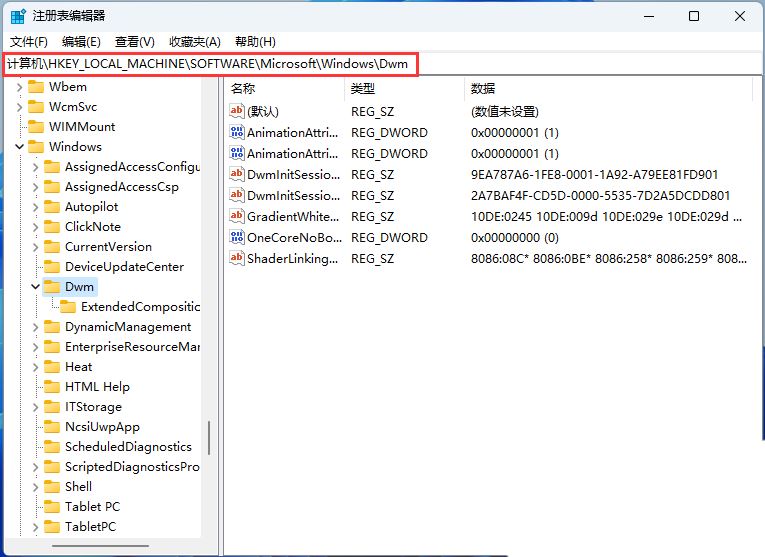 4、注冊表編輯器窗口中,依次展開到以下路徑:HKEY_LOCAL_MACHINE\SOFTWARE\Microsoft\Windows\Dwm
