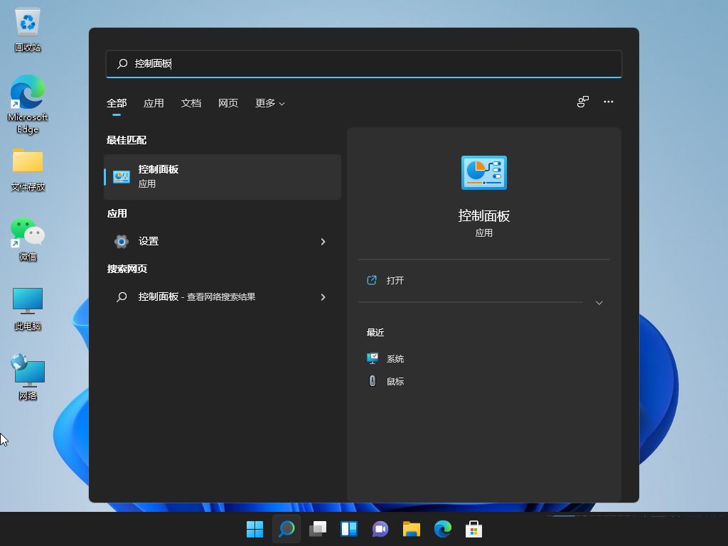 1、按【Win + S】組合鍵,或點擊任務欄上開始圖標旁邊的【搜索圖標】,在打開的Windows 搜索中,搜索框輸入【控制面板】,然后點擊打開系統給出的最佳匹配【控制面板應用】;