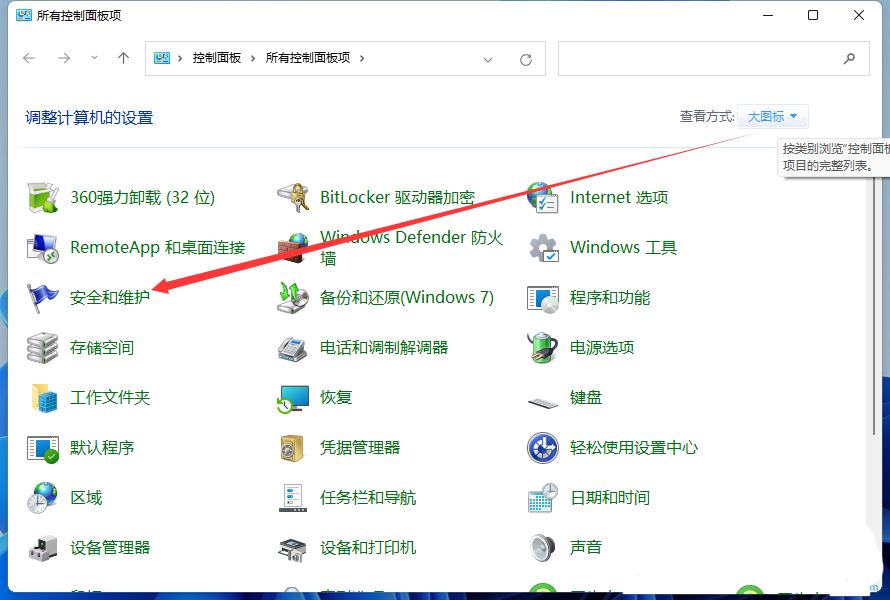 2、所有控制面板項窗口,切換到【大圖標】查看方式,然后找到并點擊調整計算機的設置下的【安全和維護】;