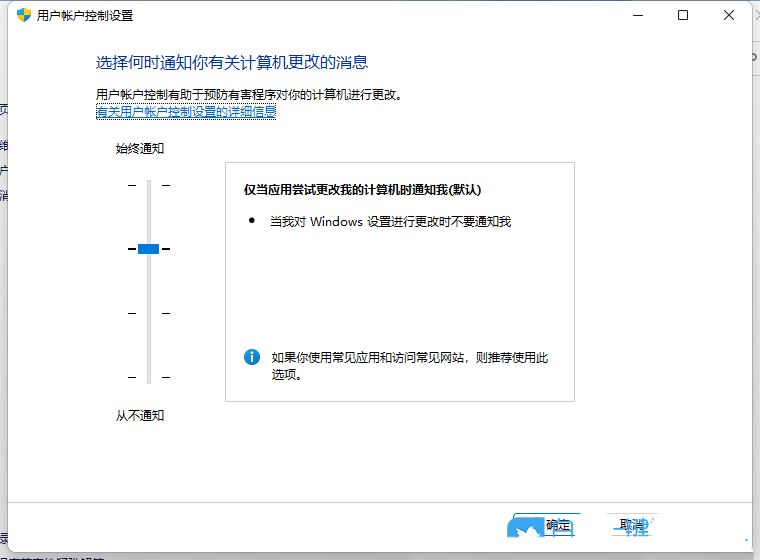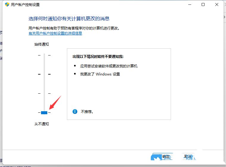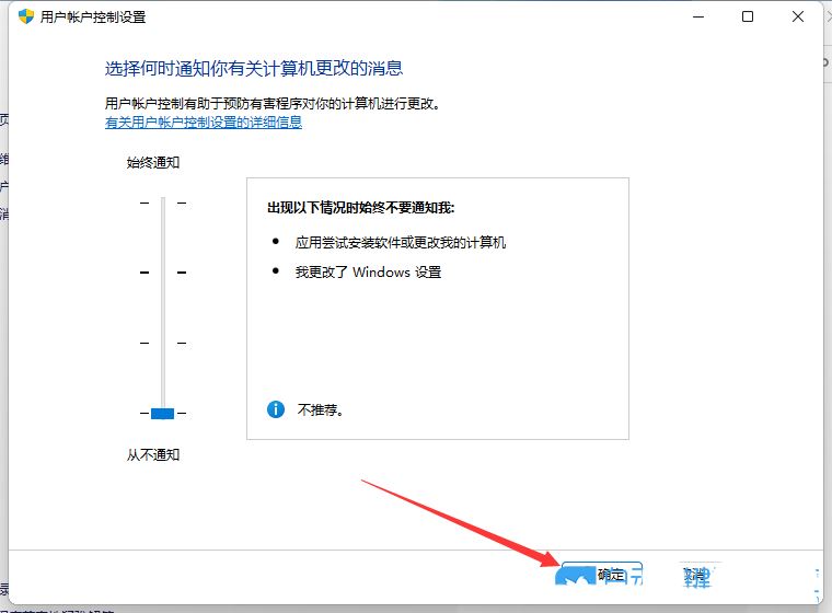 6、設置完成后,點擊窗口底部的【確定】,保存用戶賬戶控制設置;