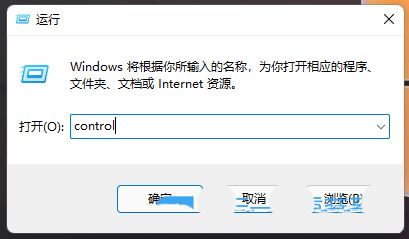 2、運行窗口,輸入【control】命令,按【確定或回車】,打開控制面板;