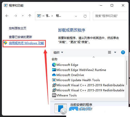 4、程序和功能窗口,左側邊欄,點擊【啟用或關閉 Windows 功能】;