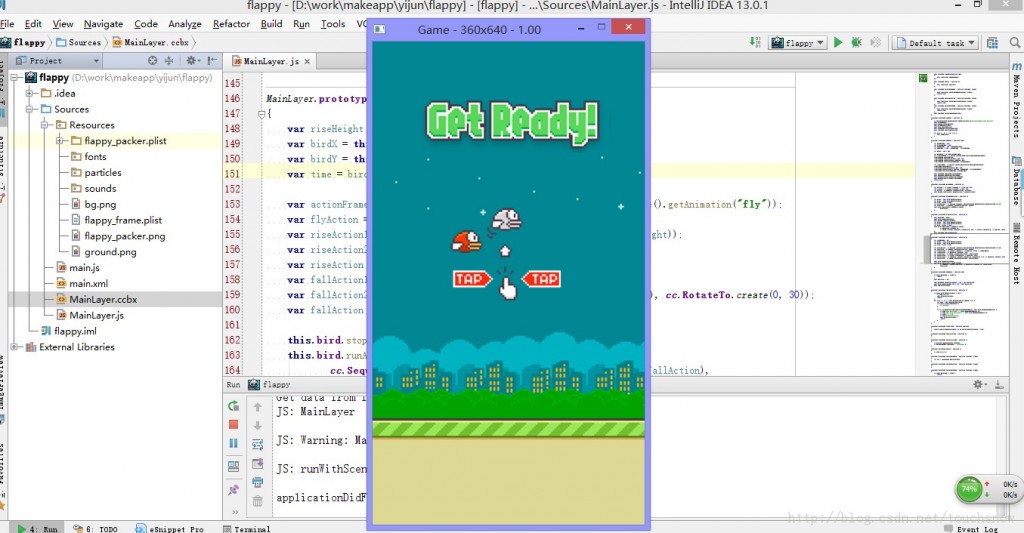 - 背景:最近火爆全球的游戲flappy bird讓筆者嘆為觀止,于是花了一天的時間山寨了一個一模一樣的游戲,現在把游戲的思路和源碼分享出來,代碼是基于javascript語言,cocos2d-x游戲引擎,cocos2d-x editor手游開發工具完成的,請讀者輕砸;ps:運行demo必須配置好coc...