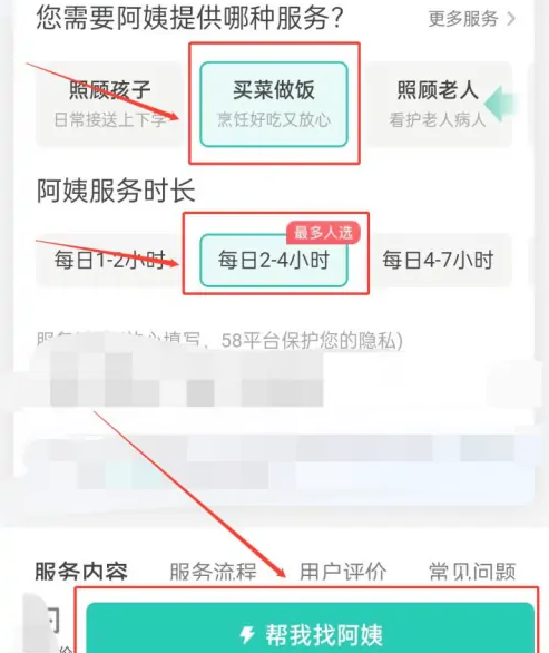 第三步,在鐘點小時工頁面,選擇服務種類和服務時長,點擊【幫我找阿姨】按鈕,就有業務人員聯系你安排合適的鐘點工。