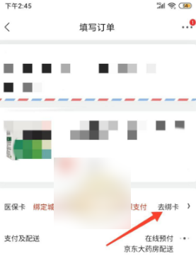 5、在“填寫訂單”頁面點擊醫保卡右側的“去綁卡”;