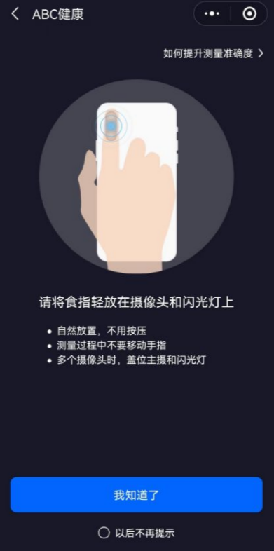 注意,按照提示,需將食指輕放在攝像頭和閃光燈上。自然放置,不用按壓,同時測量過程中不要移動手指。手機如果有多個攝像頭時,需蓋位主攝和閃光燈。