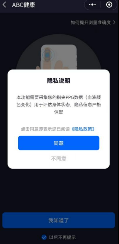 (五)同意“隱私聲明”。然后就可以按照上面的提示把手指放在攝像頭和閃光燈處進行檢測。時間為90秒。中途需靜靜等待檢測。