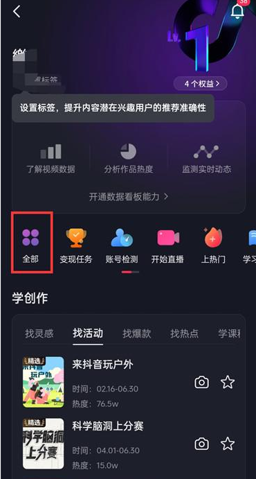 4.點擊過后在抖音創作者中心中點擊【全部】;
