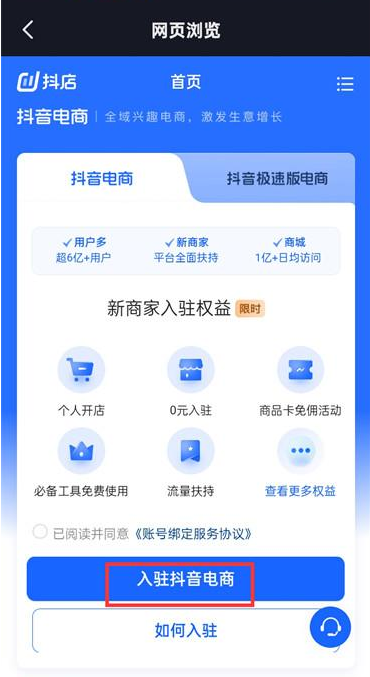 6.最后來到開通小店的頁面點擊【入駐抖音電商】即可;